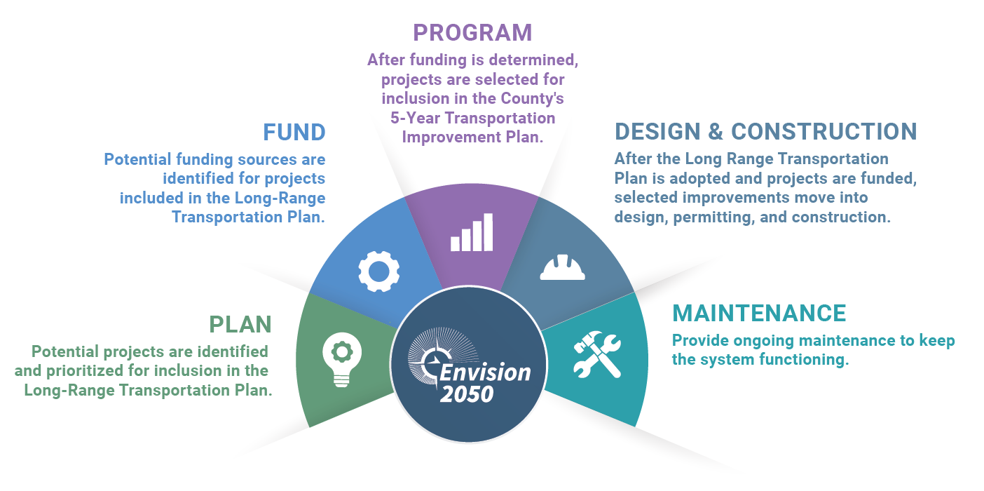 A Long-Range Transportation Plan (LRTP) is a state required strategic document that guides transportation investments and policy decisions for a 20–25-year planning horizon. You can think of it as a comprehensive blueprint that helps the county make smart and coordinated decisions about transportation.